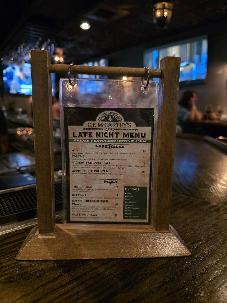 The menu at C.f. Mccarthy's offers a diverse selection of beverages and comfort foods, making it an ideal spot for a relaxed dining experience. Among the standout items, their beer offerings include a variety of craft brews like Guinness Draught, known for its smooth, rich flavor, and Jack's Abby Craft Lagers Peanut Butter Cup Barrel-Aged Framinghammer, which brings a unique twist to traditional lagers with its nutty, sweet undertones. Beer enthusiasts will also appreciate Singlecut Beersmiths Eric More Cowbell! Nitro, a nitro-infused beer with a creamy texture, and Zero Gravity Madonna, a flavorful brew that perfectly balances bitterness and smoothness. For cider lovers, Citizen Cider Unified Press offers a crisp, refreshing option.
