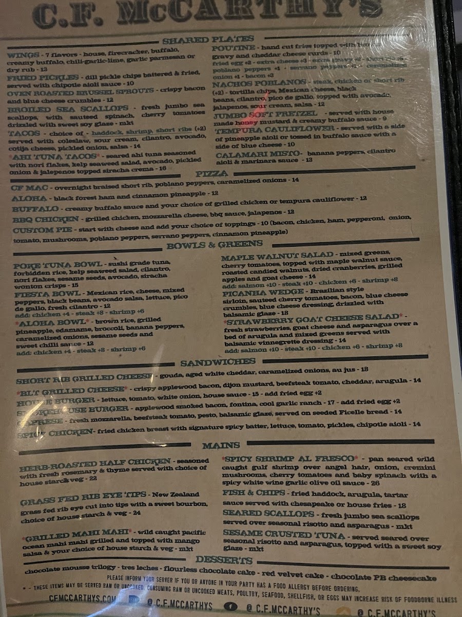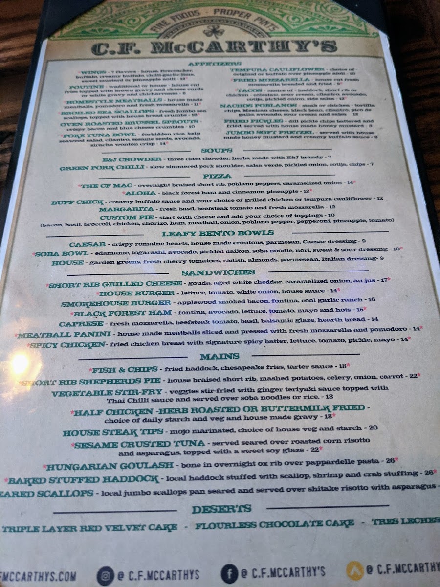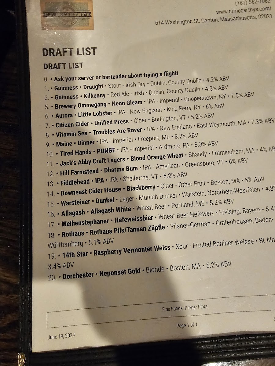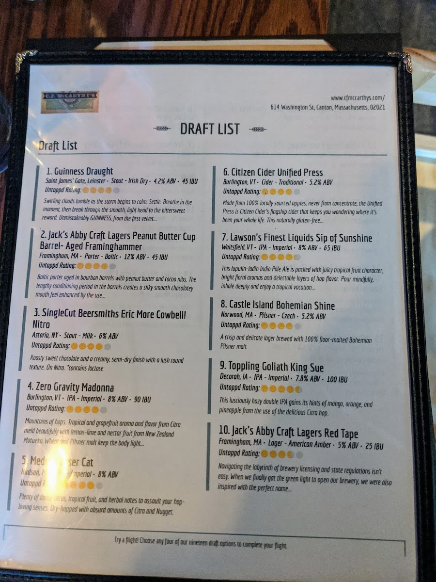 The food menu, while not explicitly detailed, promises the same level of quality and attention to detail. With such an impressive array of beverages, it’s clear that C.f. Mccarthy's is dedicated to providing a well-rounded and enjoyable dining experience, making it a go-to destination for both food and drink lovers alike. Whether you're there to enjoy a cold beer or a unique craft brew, the menu offers a variety of flavors that cater to all tastes, ensuring something for everyone.
